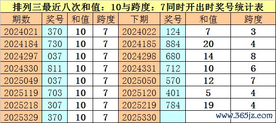 开奖回来:体彩胪列三第2025329期奖号为:370。和值为:10,跨度为:7。